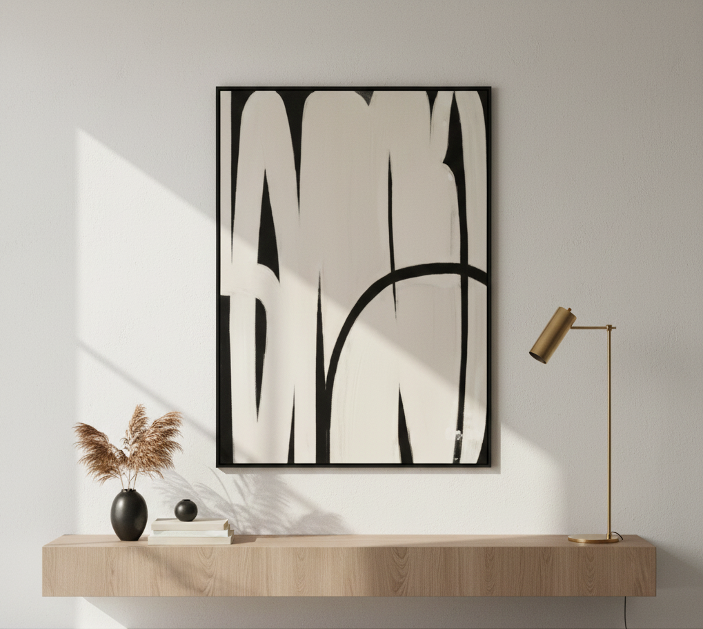 This is a stunning minimalist abstract painting in a classic black and white (or deep black and creamy off-white) color palette, presented in a sleek black frame.